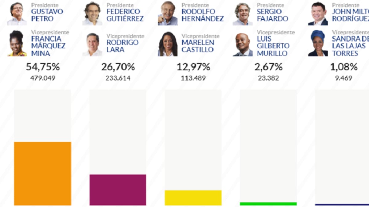 Con el 100 % de las mesas informadas, el candidato del Pacto Histórico se quedó con el 54, 75 % de los votos, que corresponde a 479.049 sufragios. Esto significa un crecimiento con relación a 2018, puesto que en esa oportunidad se quedó con 331.68 votos (38,52 %).