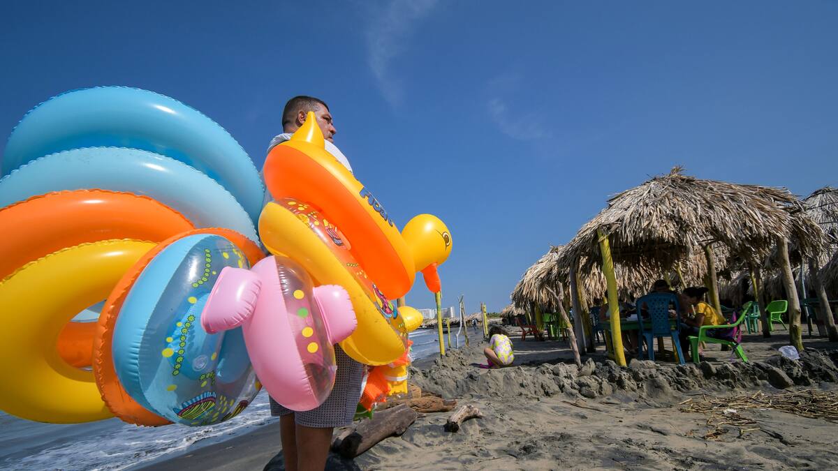 Con tan solo una docena de baldes y flotadores vendidos en lo que va corrido del mes de diciembre, Miguel Ángel Moreno Barraza se pasea por la orilla de la playa de Salgar, guardando la esperanza de que la afluencia de visitantes aumente, y con ello las ventas para poder llevar el sustento a su familia.