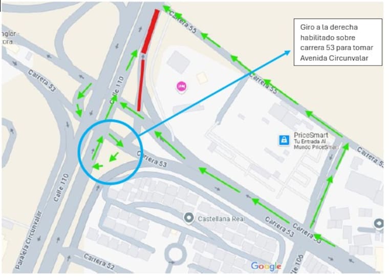 La Secretaría de Tránsito y Seguridad Vial ha dispuesto una serie de desvíos para garantizar la movilidad y minimizar los inconvenientes a los conductores. Los vehículos que circulen por la carrera 53 en sentido oriente-occidente y deseen continuar hacia la Avenida Circunvalar, en dirección sur-norte, deberán realizar un giro a la izquierda debajo del puente de la Circunvalar. Luego, deberán continuar por la carrera 53 en sentido occidente-oriente, realizar un giro a la derecha o tomar la calle 106 para continuar hasta la carrera 55 en dirección oriente-occidente y, finalmente, retomar la Avenida Circunvalar.