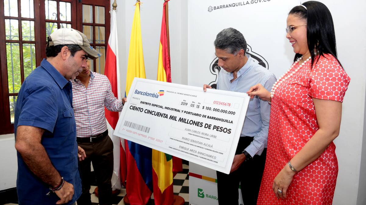 Con la entrega de un cheque simbólico, el banco privado Bancolombia formalizó ante el alcalde Distrital, Alejandro Char, la entrega de recursos por $150 mil millones con los que la Administración podrá continuar ejecutando obras 'de gran impacto' en beneficio de los barranquilleros.