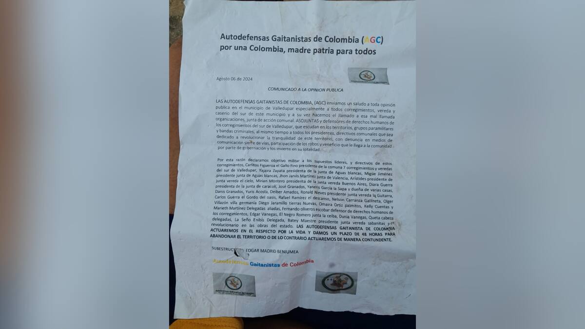 “Hacemos un llamado a esas mal llamadas organizaciones de Juntas de Acción Comunal, Asojuntas, defensores de Derechos Humanos de los corregimientos del sur de Valledupar, que escudan en los territorios, grupos paramilitares y bandas criminales; al mismo tiempo a todos los presidentes y directivos comunales que se han dedicado a revolucionar la tranquilidad de este territorio con denuncias en medios de comunicación”, señala el escrito del grupo alzado en armas que se identifican como miembros de la subestructura Edgar Madrid Benjumea de las AGC.