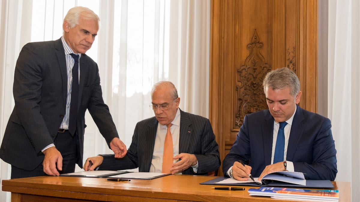El presidente Iván Duque y el secretario general de la Organización para la Cooperación y el Desarrollo Económicos, Ocde, José Ángel Gurría, suscribieron este lunes en París un memorando de entendimiento en el que acordaron que esta organización se compromete a brindar apoyo a la estrategia anticorrupción del Gobierno.