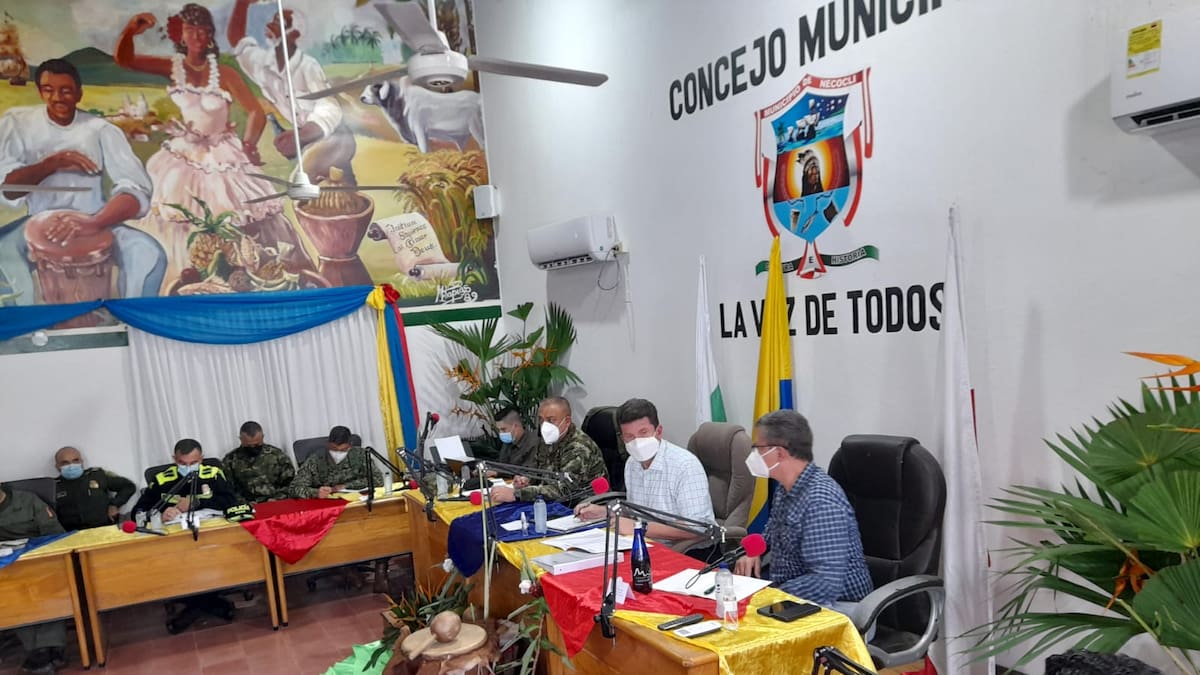 El ministro de Defensa, Diego Molano Aponte, encabezó en Necoclí una 'reunión interinstitucional' con autoridades departamentales y municipales, con los altos mandos militares y de la Policía, Migración Colombia y con la Defensoría del Pueblo, para analizar la situación migratoria y los impactos que pueda tener el orden público, a fin de adoptar un plan de acción que garantice la normalidad y la tranquilidad en esta región del país tras el represamiento de casi diez mil ciudadanos extranjeros que han llegado en situación irregular.