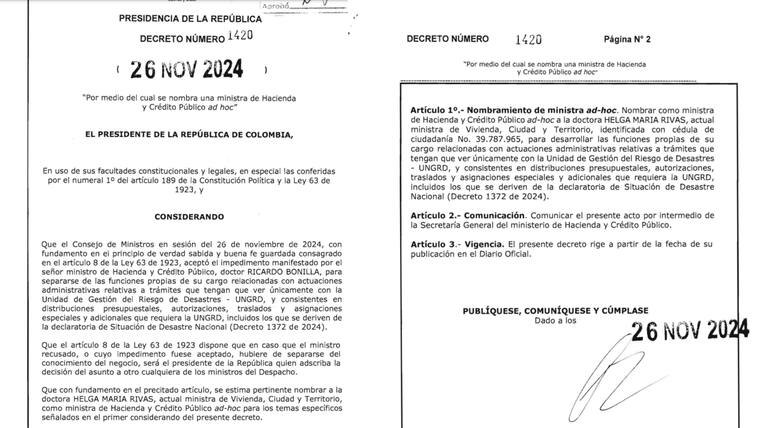 El presidente Gustavo Petro hizo el nombramiento de la ministra de Vivienda, bajo los Decretos 1419 y 1420 del 26 de noviembre de 2024, los cuales delimitan las funciones específicas que tendrá Rivas Ardila como ministra ad-hoc de estas carteras.