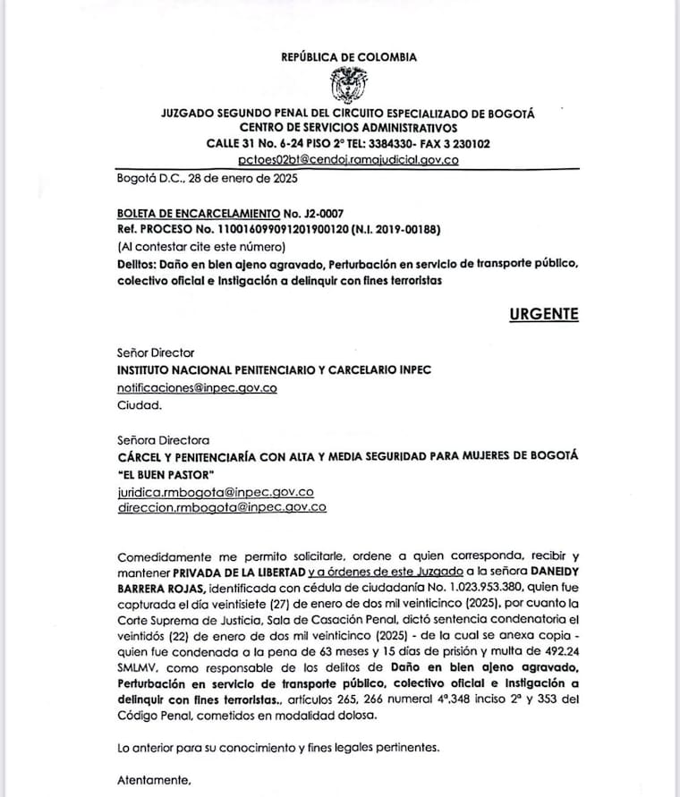 La sentencia en su contra fue emitida por delitos relacionados con los daños ocasionados en noviembre de 2021 durante manifestaciones en Bogotá. En esa ocasión, Barrera Rojas publicó videos en los que se le veía afectando infraestructura de TransMilenio.