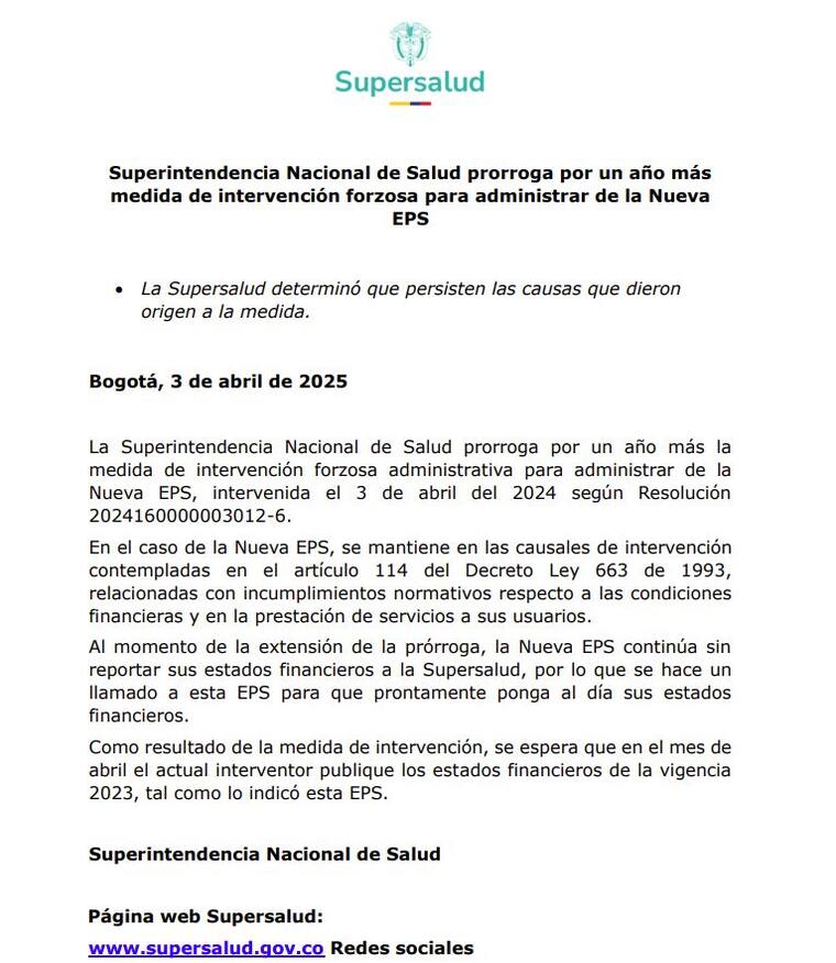 “En el caso de la Nueva EPS, se mantiene en las causales de intervención (bajo Resolución 2024160000003012-6) contempladas en el artículo 114 del Decreto Ley 663 de 1993, relacionadas con incumplimientos normativos respecto a las condiciones financieras y en la prestación de servicios a sus usuarios”, se lee en el comunicado.
