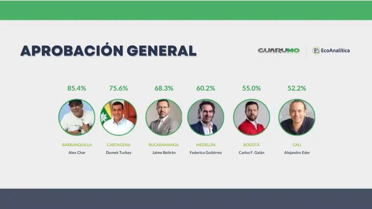 En la lista también aparecen los alcalde de Bucaramanga, Jaime Beltrán (68.3 %); el de Medellín, Federico Gutiérrez (60.2 %); el de Bogotá, Carlos Fernando Galán (55.0 %), y el de Cali, Alejandro Eder (52.2).