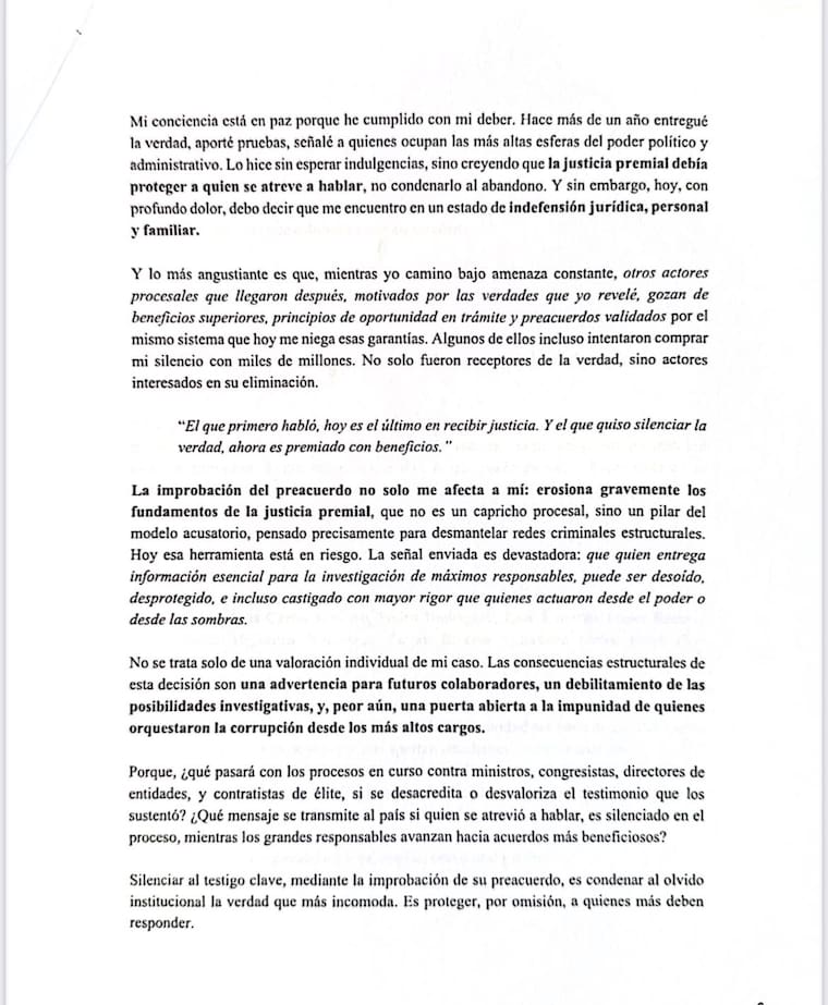 "Mi conciencia está en paz porque he cumplido con mi deber. Hace más de un año entregué la verdad, aporté pruebas, señalé a quienes ocupan las más altas esferas del poder político y administrativo. Lo hice sin esperar indulgencias, sino creyendo que la justicia premial debía proteger a quien se atreve a hablar, no condenarlo al abandono. Y sin embargo, hoy, con profundo dolor, debo decir que me encuentro en un estado de indefensión jurídica, personal y familiar", se lee en la carta.