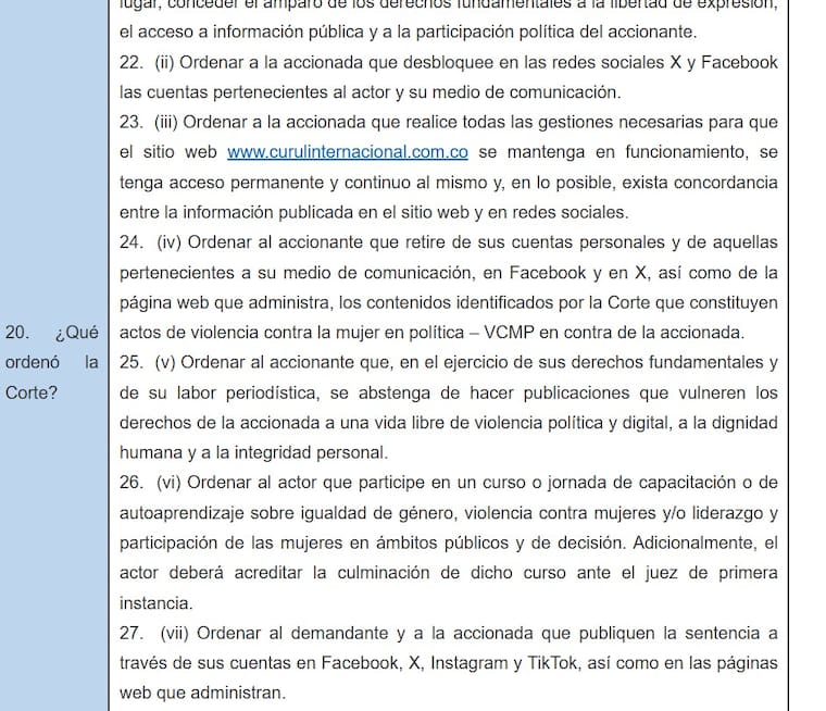 La Corte le dio la razón parcialmente a Marín. Reconoció que fue una medida desproporcionada bloquearlo totalmente, pero también concluyó que él había incurrido en violencia simbólica y verbal basada en género, al utilizar expresiones discriminatorias que afectaban la dignidad de la congresista como mujer indígena en la política.