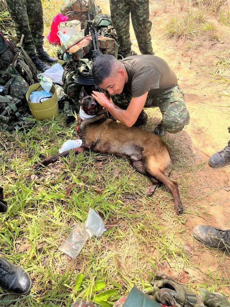 A pesar de la gravedad de la herida, el animal logró responder al llamado de su guía, el soldado profesional Carlos Eduardo Beleño González, quien lo rescató de la zona.