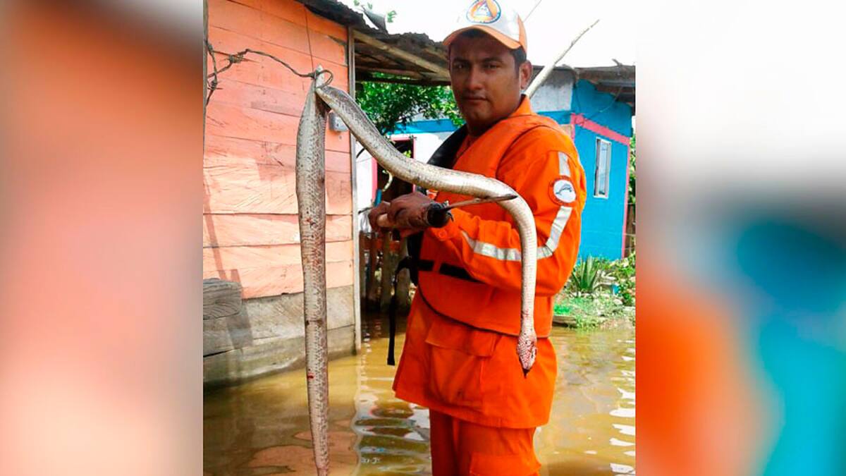 En medio de la actividad de socorro los voluntarios de la Defensa Civil han salvado a la comunidad de ser atacada por serpientes tipo Mapaná, que vienen en la creciente.