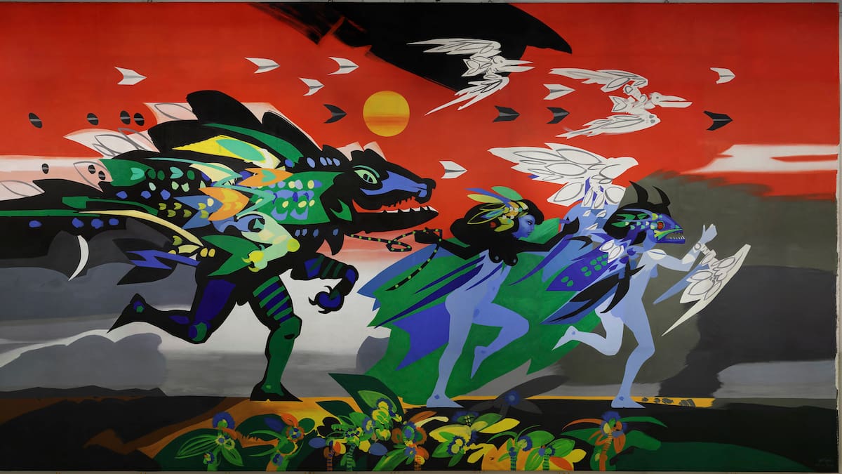 Este acrílico de 20 metros cuadrados, tensado en bastidor de madera y hierro, fue la última obra pública de Obregón, en la que el pintor recuperó una popular leyenda del Caribe según la cual un hombre se convierte en caimán para espiar y cazar a las mujeres que se bañan en las riberas del Magdalena.