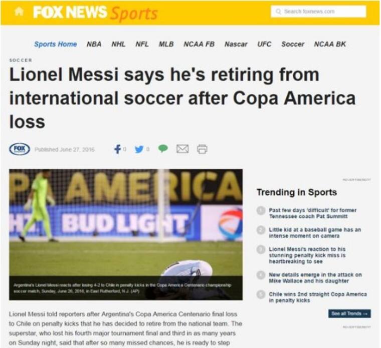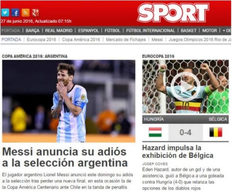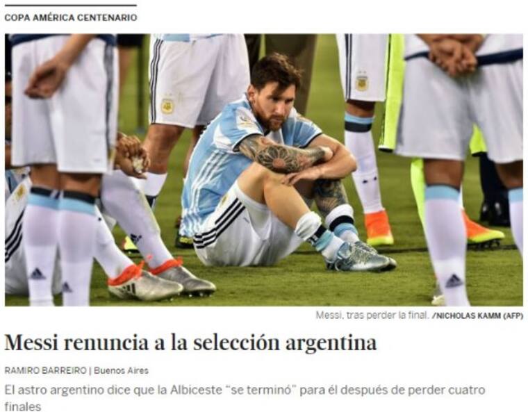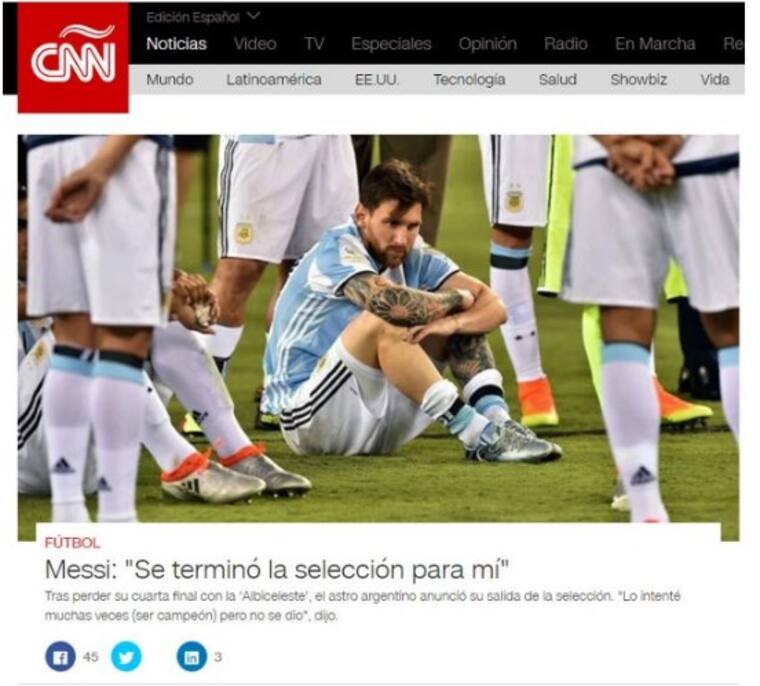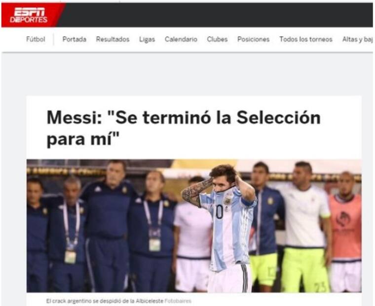 La mayoría de los medios internacionales reaccionaron tras las declaraciones de la ‘Pulga’, tal es el ejemplo de dos reconocidos diarios argentinos como La Nación y Clarín, que titulan con la expresión que dio Leo al final del juego: 'Messi anunció su retiro de la selección: 'Se terminó para mí; ya está, lo intenté mucho pero no se da'' y 'Renunció Messi: 'Se terminó para mí la Selección''.