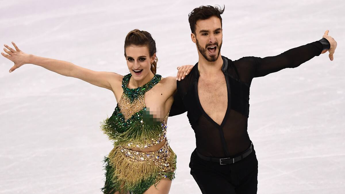 Este lunes durante el programa corto de danza sobre hielo el vestido de la francesa se rompió y dejó al descucbierto uno de sus senos.