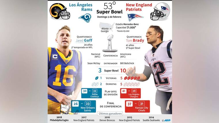 Tom Brady perseguirá entrar en la historia del fútbol americano con su sexta corona de campeón en el Super Bowl, cuando sus New England Patriots se enfrenten hoy (desde las 6:30 p.m.) a Los Angeles Rams del genio ofensivo Sean McVay en un duelo de estilos y generaciones que busca reescribir el futuro de la NFL.