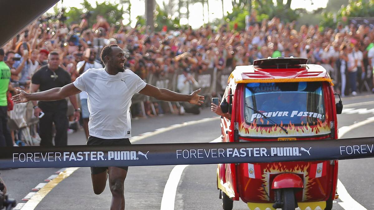 La leyenda del atletismo Usain Bolt participó en una colorida carrera de exhibición contra una mototaxi, apenas horas después de llegar a Lima para promover una línea de ropa deportiva.