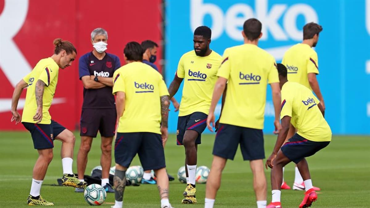 La imagen de los jugadores en círculo en el campo de entrenamiento fue una de las más repetidas en esta 'vuelta' a la 'casi normalidad'. Así apareció también el Barcelona en la ciudad deportiva Joan Gamper. Quique Setién comprobó la progresión del zaguero francés Samuel Umtiti, quien se lesionó en un sóleo hace tres semanas y completó al mismo ritmo que sus compañeros casi toda la sesión.