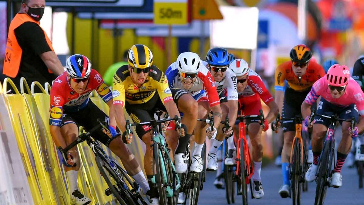 Dylan Groenewegen cruzó primero la línea de meta en plena caída contra el asfalto, pero lo hizo tras cerrar el paso a Jakobsen contra las vallas cuando éste buscaba un hueco por la derecha del pelotón.