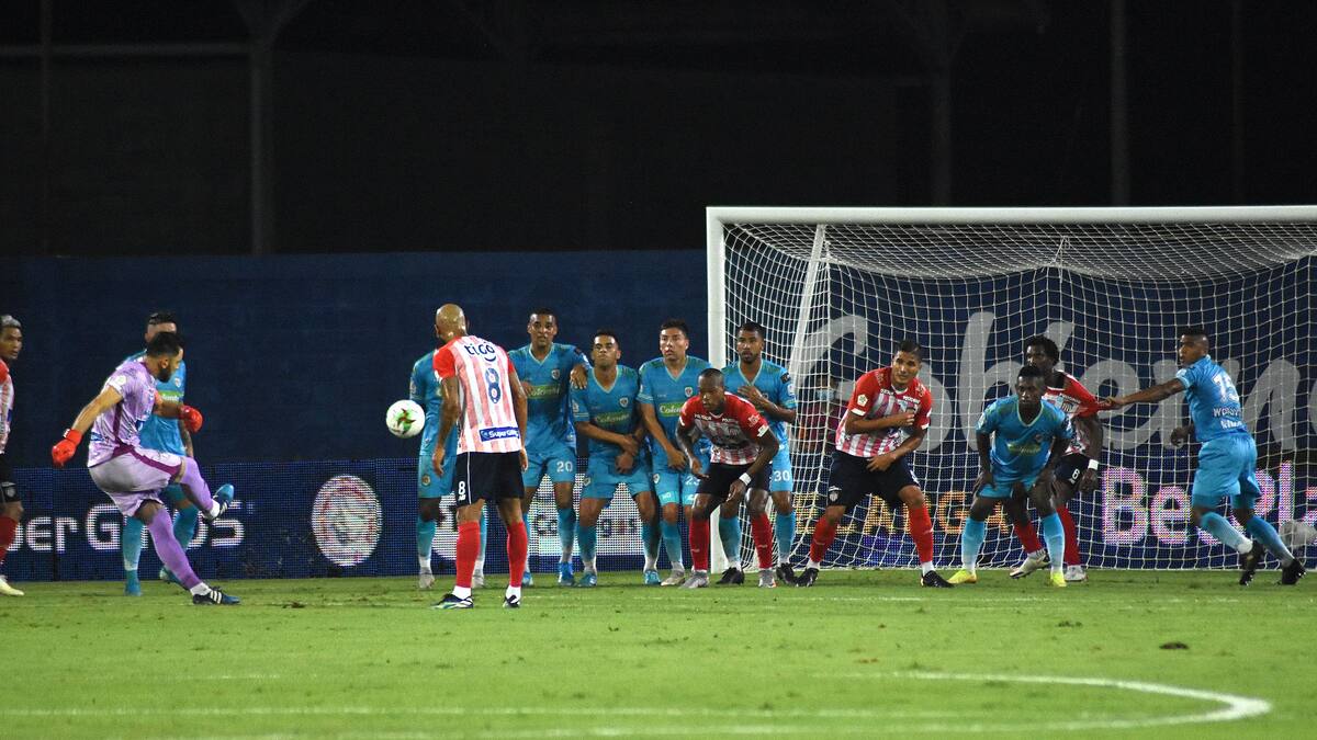 El guardameta uruguayo, que llegó a 400 partidos con Junior en la liga colombiana, abrió el marcador con un golazo de tiro libre que dejó para la foto a José Luis Chunga, su ex compañero y arquero de Jaguares.