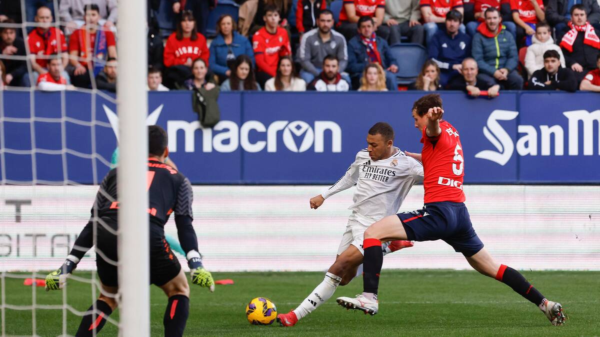 El Sadar recibió a ambos conjuntos con un mosaico propio de las grandes ocasiones antes de que diese comienzo la 24ª jornada para unos blancos que se jugaban el liderato. A los dos minutos, Mbappé tiró un desmarque para pisar área delante de Catena, poniendo un centro medido que Vinicius, solo, envió fuera de cabeza.
