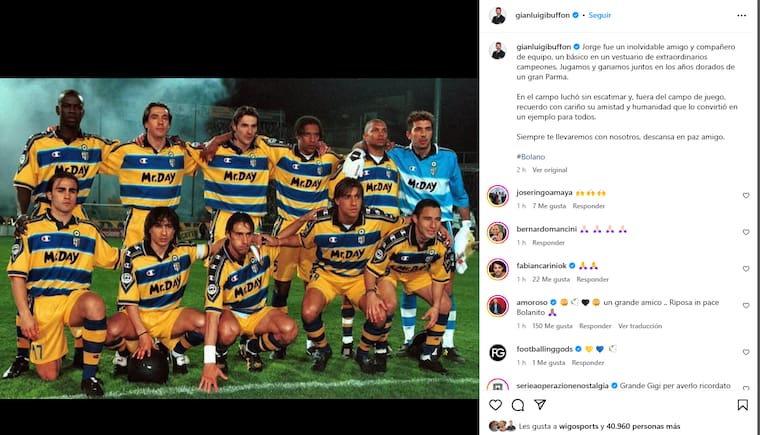 “Jorge fue un inolvidable amigo y compañero de equipo, un básico en un vestuario de extraordinarios campeones. Jugamos y ganamos juntos en los años dorados de un gran Parma”, publicó Buffon con una foto de un onceno del Parma en el que aparecen él y Bolaño.