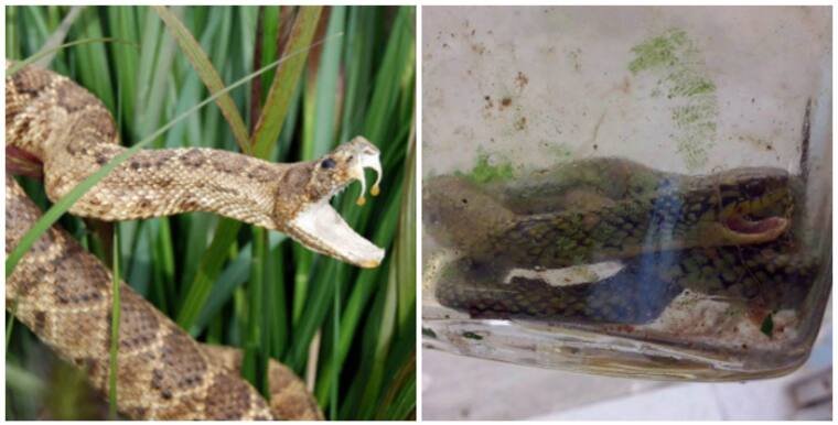 A la izquierda una serpierte yarará o yararaca frente a la serpiente que el niño mato ( derecha).