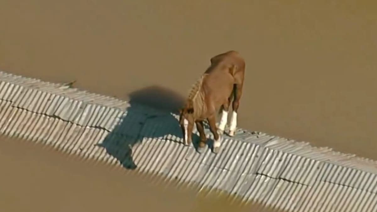 Una de esas imágenes se dio a conocer este miércoles 8 de mayo. El canal Globo News publicó en sus redes un video donde se observa desde la cámara de un helicóptero, a un caballo que quedó atrapado en el techo de una de las construcciones, sin posibilidad de moverse a otro sitio. En el clic se nota cómo todo alrededor del animal está completamente tapado por las aguas.