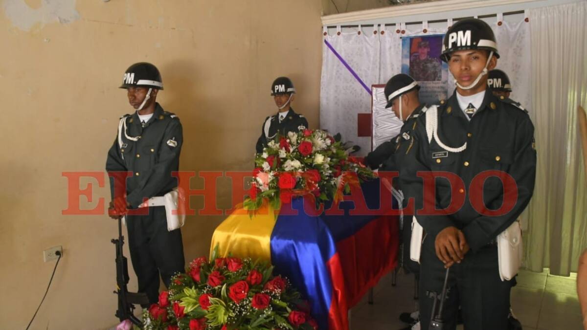 Cuatro soldados adscritos al Batallón Paraíso hacen guardia de honor para acompañar el féretro del cuerpo de Johan Escudero, que ya se encuentra en la sala de su casa, ubicada en el municipio de Malambo, área metropolitana de Barranquilla.