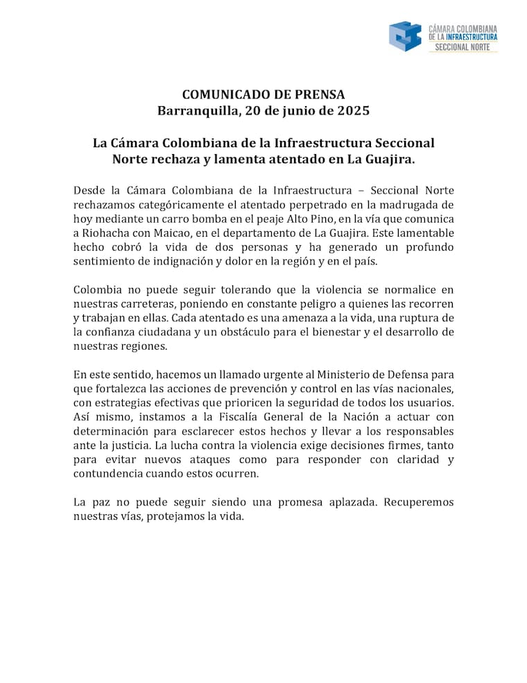 Al respecto, la Cámara Colombiana de la Infraestructura Seccional Norte, expresó su rechazo categórico a este tipo de actos violentos a través de un comunicado oficial compartido.