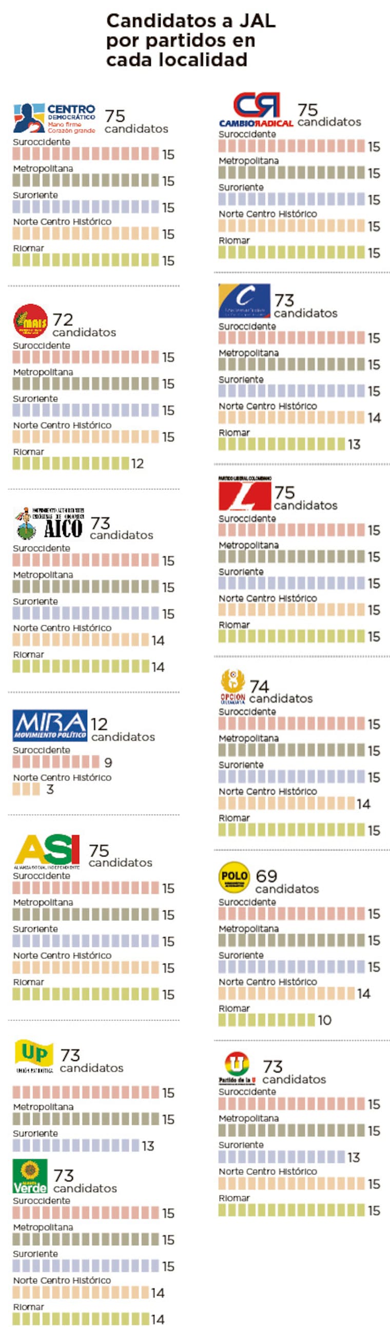 Un total de 862 personas pertenecientes a 13 partidos y movimientos políticos están aspirando a los 75 puestos en las Juntas Administradoras Locales (JAL) de Barranquilla (ver infografía), en las elecciones de este 25 de octubre. Cada localidad, Riomar, Norte Centro Histórico, Suroriente, Suroccidente y Metropolitana, tiene 15 curules.