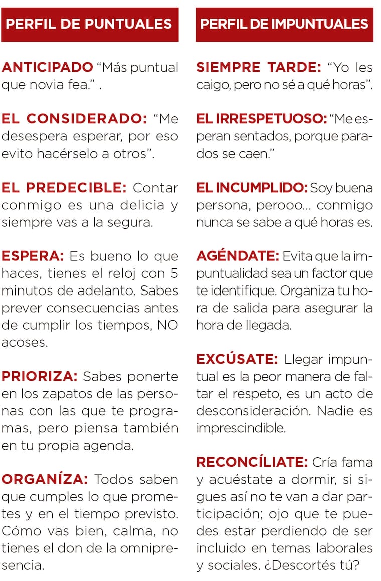 Repaso: Si eres puntual, espera, prioriza, organiza y comprende y si eres impuntual agéndate, excúsate, reconcíliate y prográmate. ¿Lección aprendida?