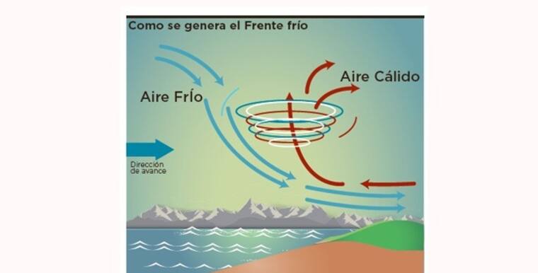 El frente frío es una franja de inestabilidad que ocurre cuando una masa de aire frío se acerca a una masa de aire caliente. El aire frío, siendo más denso, genera una 'cuña' y se mete por debajo del aire cálido y menos denso.