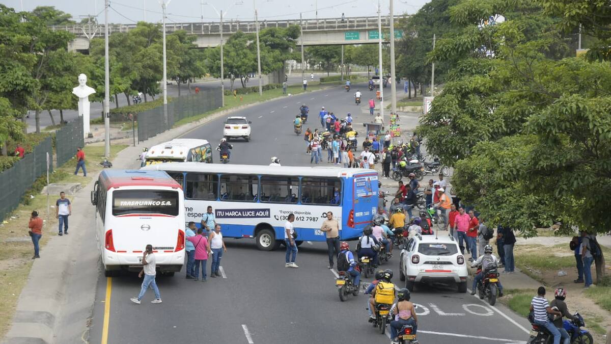 Conductores de las empresas de buses que operan en Barranquilla y su área metropolitana bloquean la Circunvalar, a la altura del barrio Las Malvinas y la Cordialidad.