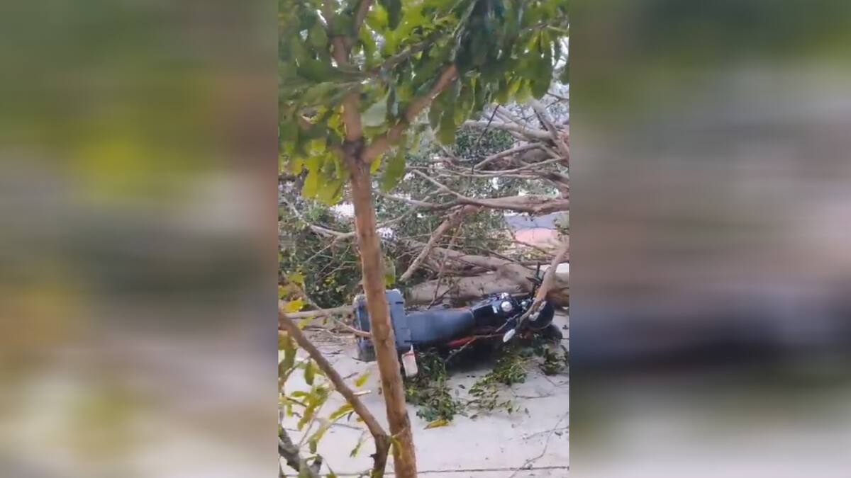 En un video que circula en redes sociales se ve cómo la motocicleta quedó en el suelo tras caer el gigantesco árbol que quedó sobre la vía.