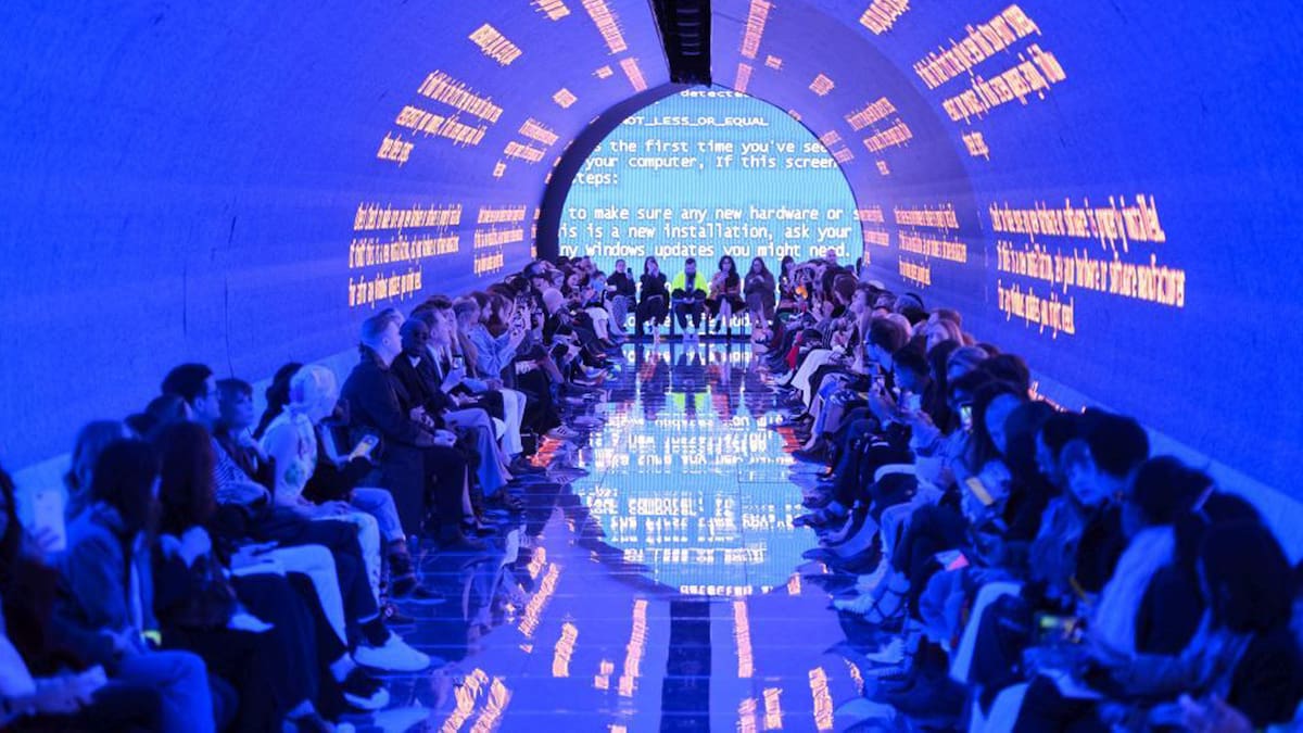En un popular suburbio al norte de París -Saint-Denis, una ubicación inédita para un desfile de la glamurosa Semana de la Moda-, la firma francesa instaló un impresionante túnel de pantallas LED curvas, con imágenes tan coloridas como angustiantes.