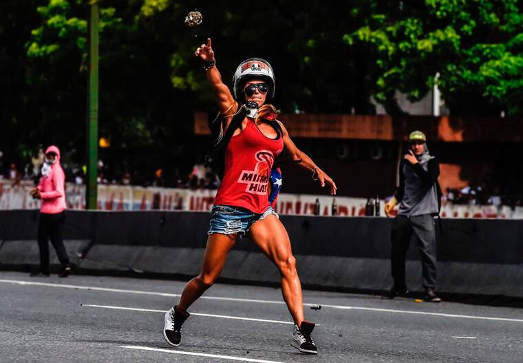 Ataviada con un short, una camiseta y un casco, Caterina Ciarcelluti, modelo y entrenadora de fitness de 44 años, lanzaba piedras contra militares el 1 de mayo. Su musculosa figura le valió el sobrenombre de 'Mujer Maravilla', convertida en una especie de superheroína para adversarios de Maduro.