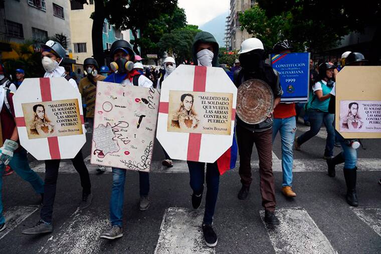 Con escudos de madera y metal, pintados con imágenes y mensajes contra el presidente Nicolás Maduro, un grupo de jóvenes ocupa la vanguardia de las manifestaciones en Caracas. Usan máscaras antigás, cascos y capuchas y los llaman 'los escuderos'.