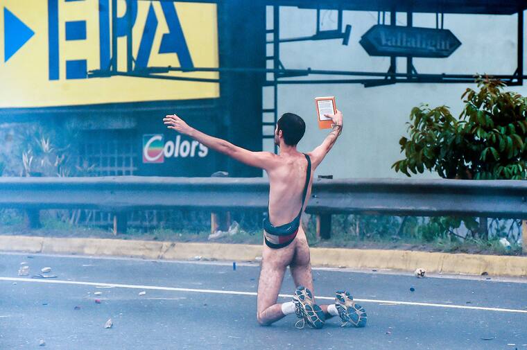 '¡No lancen más bombas, por favor!', suplicó Hans Wuerich, de 27 años, completamente desnudo sobre un blindado, mientras caminaba impávido ante una nube de gases lacrimógenos. Desconcertados, agentes de la Policía Nacional le ordenaron bajarse del vehículo y lo obligaron a retroceder disparándole perdigones, que le dejaron varias marcas en la espalda.
