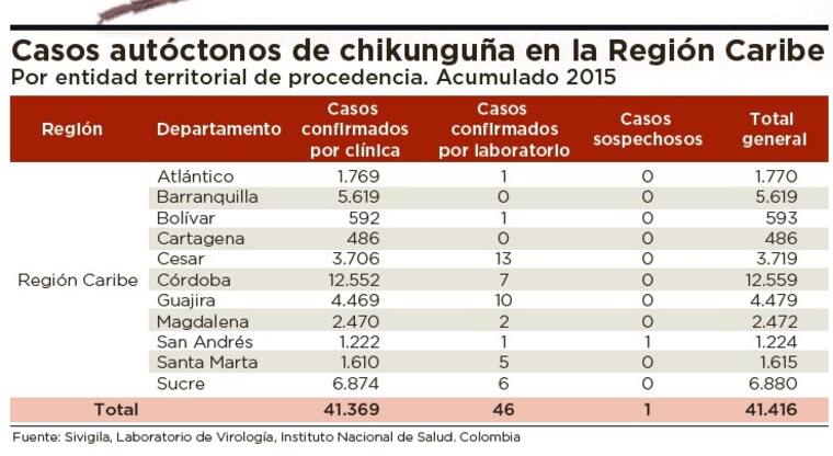Y en lo que va de 2015, el Instituto Nacional de Salud confirma que en Colombia han ocurrido 61 muertes por el virus, de las cuales solo 18 sucedieron en Tolima. En la Región Caribe: Cesar, Bolívar, Sucre, Córdoba, Magdalena y La Guajira presentan entre todos 11 casos.