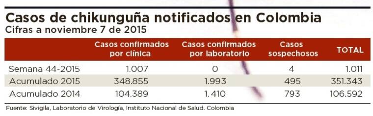 Según las unidades de análisis realizadas en el Instituto Nacional de Salud con registro acumulado 2014-2015 (corte a la semana epidemiológica 44), se han confirmado 72 muertes por chikunguña en el país, de las cuales siete tienen relación con dengue.