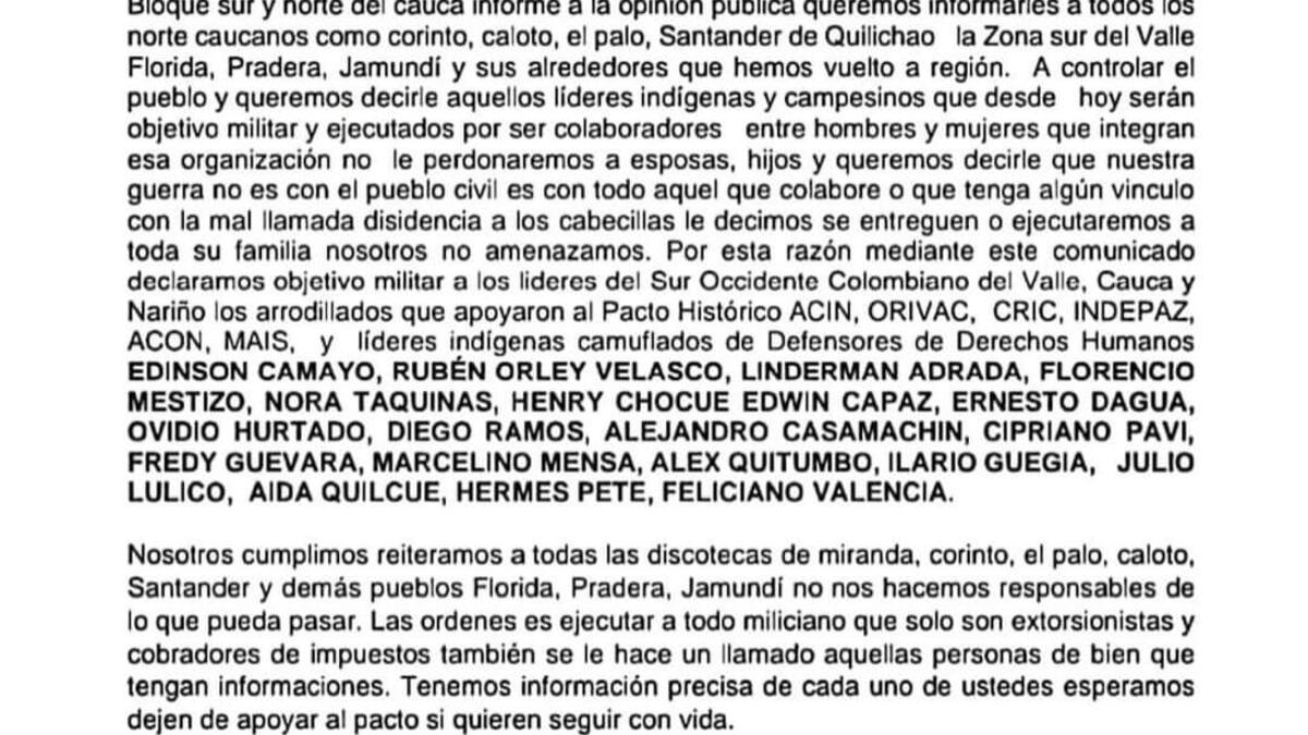 Uno de los panfletos está firmado por el Bloque Sur y Norte de Cauca, que tiene influencia en Corinto, Caloto, El Palo, Santander de Quilichao y zona sur del Valle, Florida, Pradera, Jamundi, y en el cual se puede leer que se declara 'objetivo militar' a líderes indígenas y campesinos.
