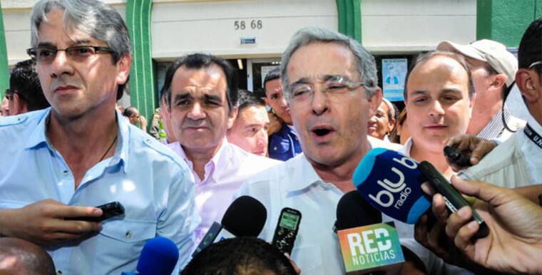 En una breve e inusual rueda de prensa, en medio del calor sofocante del mediodía y debajo de un roble frente a la Delegación departamental de la Registraduría, donde estaban apostados los periodistas -ya que se les impidió ingresar a la inscripción de la lista a la Cámara de Representantes por el UCD por darles prelación a familiares y amigos de estos-, el expresidente volvió a la carga contra Juan Manuel Santos.