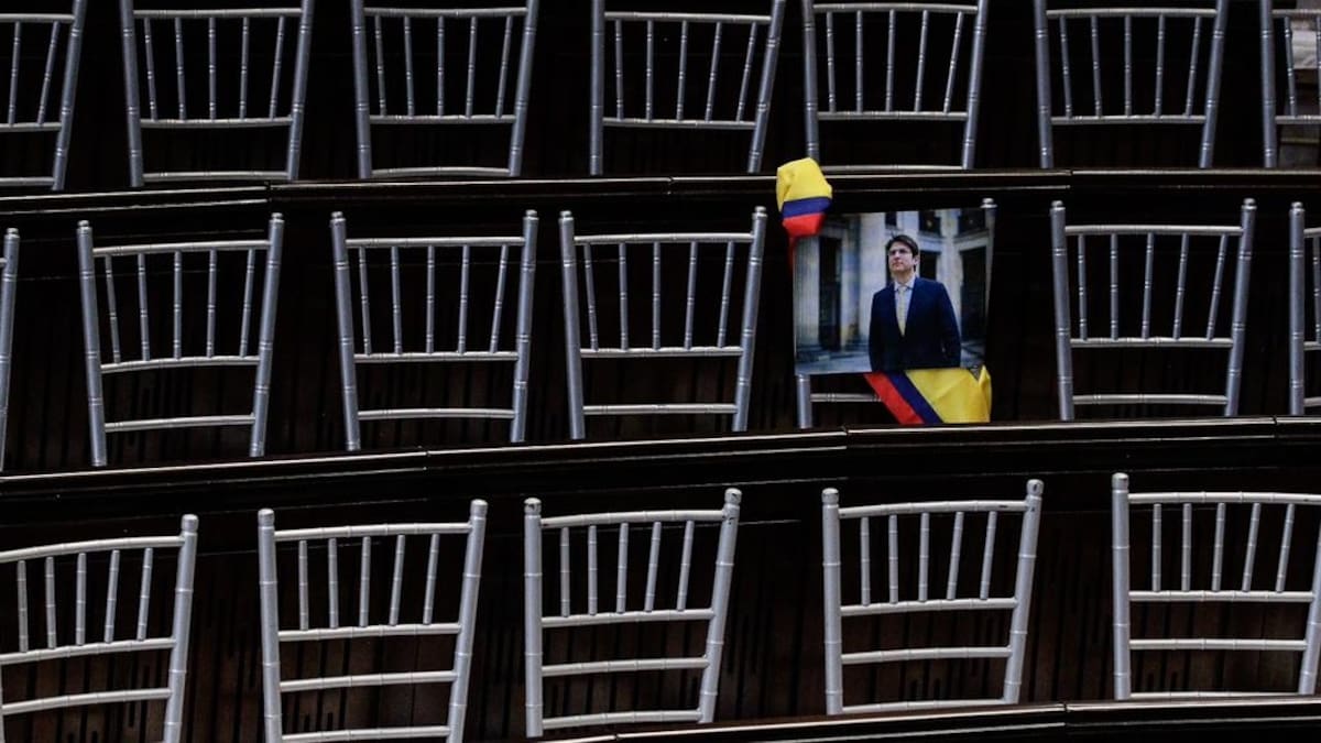 A manera de homenaje y como una muestra más de solidaridad del Congreso y de todo el país con el senador y precandidato presidencial Miguel Uribe, quien se mantiene en cuidados intensivos desde el pasado 7 de junio, cuando fue víctima de un atentado con arma de fuego en el occidente de la capital, en la curul del Salón Elíptico que le correspondía ocupar este domingo 20 de julio, día de la instalación de la legislatura, se dispuso un arreglo con la bandera de Colombia y la foto del parlamentario del Centro Democrático.