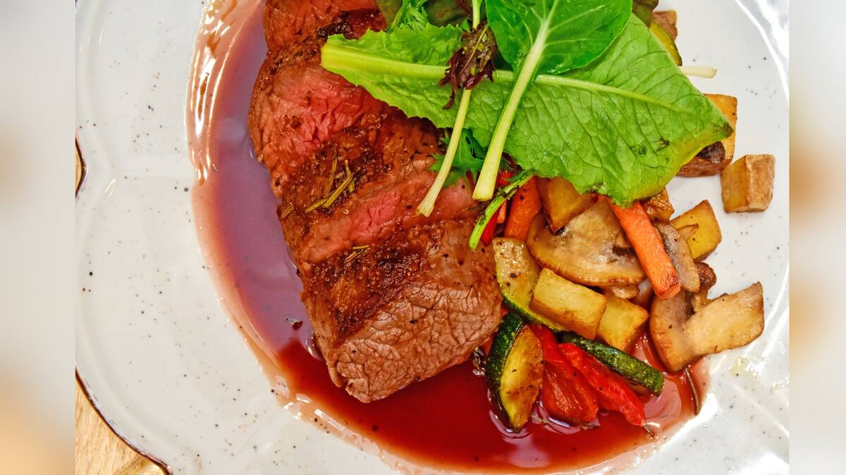 250 g de lomo fino • 30 ml de vino tinto • 50 ml de jugo de corozo • 30 ml demi-glace (fondo de res) • 15 g de mantequilla • 70 g de papas precocidas • 20 g de zanahorias cortadas en julianas previamente cocidas • 30 g de zucchini cortado en cubos • 25 g de champiñones y 30 g de pimentón y cebolla asada • Sal y pimienta al gusto