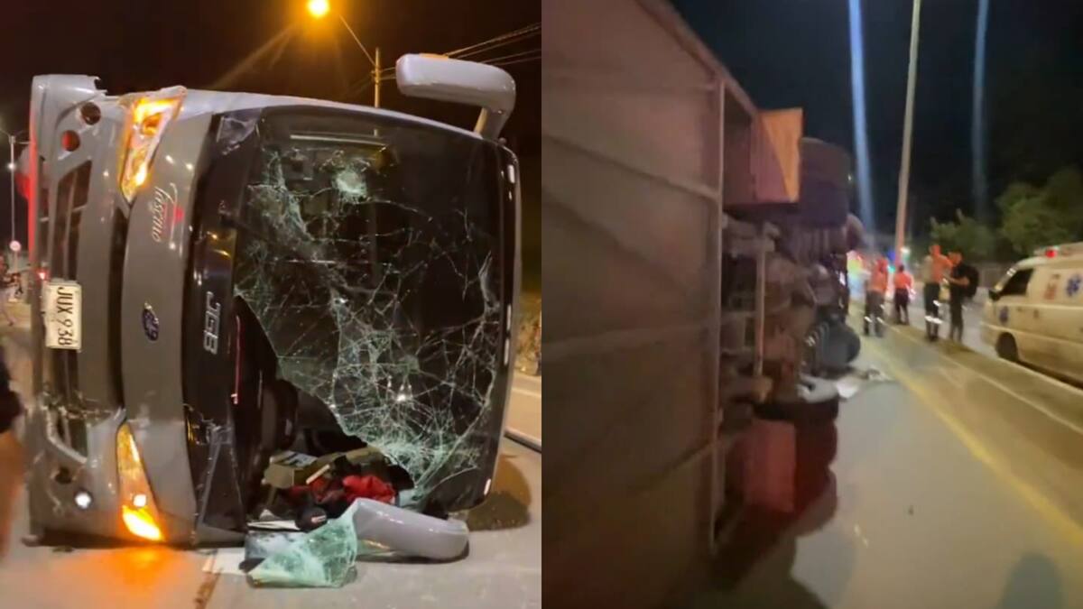 Jessi Uribe, quien no iba a bordo del vehículo, publicó en las historias de su cuenta en Instagram un video en el que se ve al bus volcado en medio de la vía.