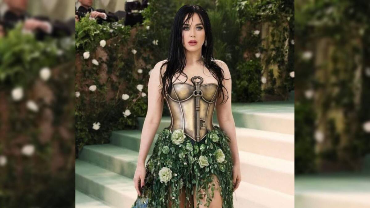 Sin embargo, sí se asemeja al escenario de la noche el de la segunda imagen compartida por Katy Perry, en la que la inteligencia artificial la ha vestido con un corsé ajustado metálico con forma de llave y una falda hecha de flores y hojas.
