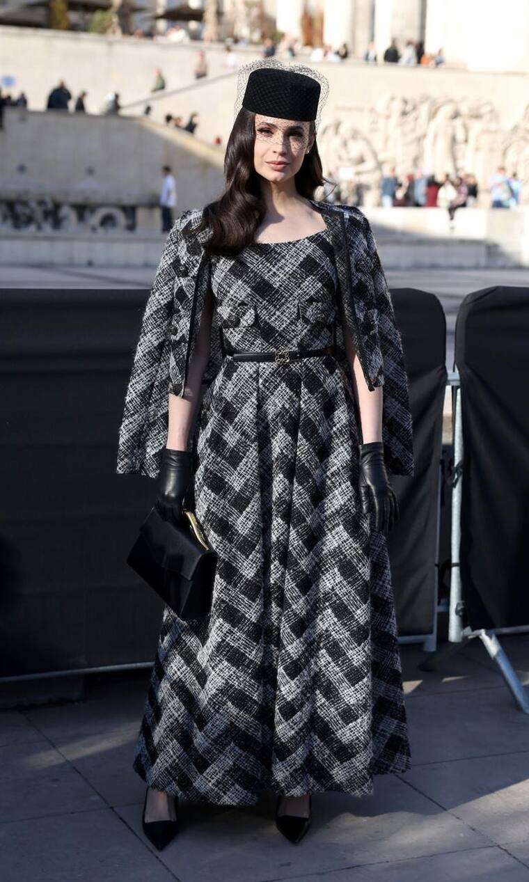 La protagonista del fenómeno juvenil Corazones malheridos acudió al show del diseñador de moda libanés Elie Saab y lo hizo con un vestido en tweed a cuadros blancos y negros. Diseño de escote redondeado con bolsillos frontales y falda acampanada que se combinó con chaqueta cropped a juego, zapatos de tacón con puntera en pico, cinturón para enfatizar la silueta, bolso de asa metálica, guantes y tocado con redecilla.