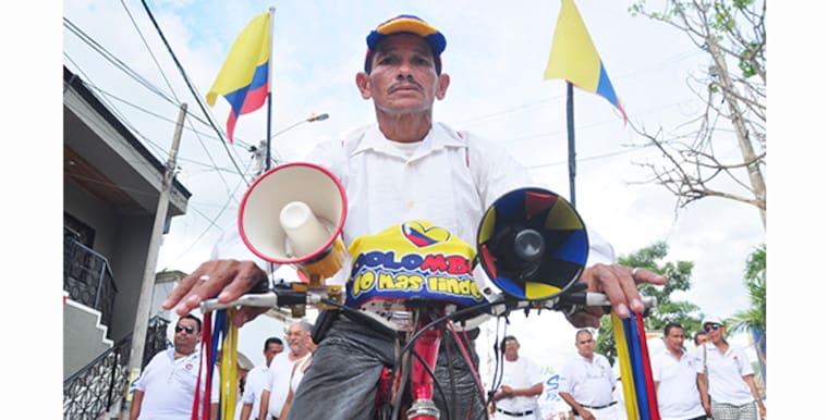 Vestido de blanco, montado en su bicicleta vestida de tricolor, le decía sí a la paz, no con su voz sino con una grabación que sale a todo volumen a través de su megáfono, su fuente de trabajo.