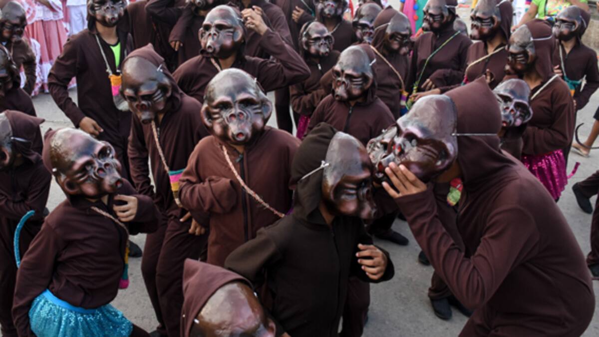 Las polleras de cumbiamberas, goleros, gorilas, congos, hombres caimanes, comparsas de cabezones y más cumbiamberas se interpusieron en la ruta hacia la manada de micos. Fue necesario caminar cerca de media hora para llegar al puesto 151 en el que el grupo jugaba a la sombra de los árboles.