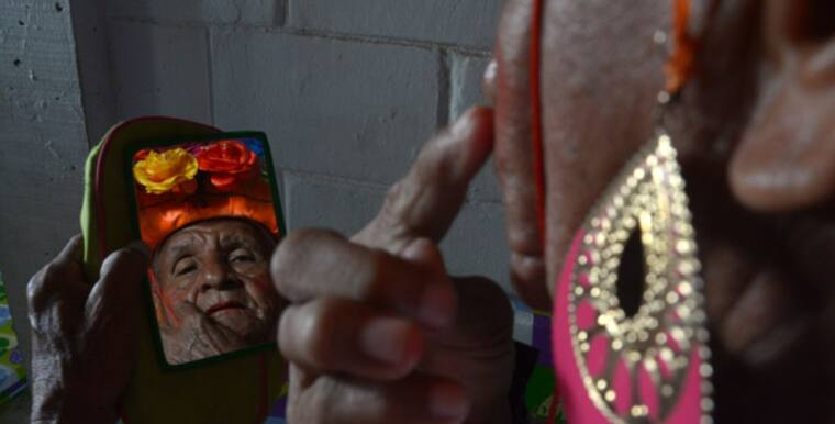Metidos en su papel, se ayudan entre ellos a componerse los vestidos. Se van pasando un lápiz labial para pintarse los pómulos y la boca, se miran al espejo para que les quede bien pintada y al final algunos lanzan un beso que su reflejo les devuelve.